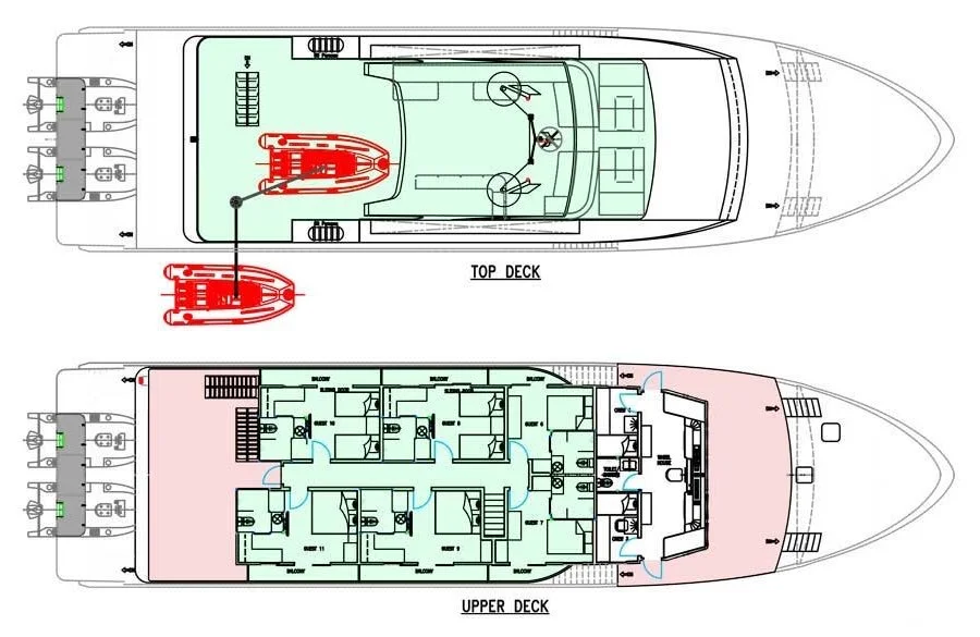 At the rear of the vessel is a large dive deck that can accommodate up to 28 divers, providing plenty of space to move around. The dive deck boasts 11 large rinse tanks of various sizes for camera rigs. The boat deck is adjacent to the dive deck and houses two 18' diving skiffs for direct and easy access. The top deck features a bar for evening gatherings and relaxation under the stars. Prefer to dine outdoors? This is the perfect area. Sufficient shelter is available on the top deck as well as areas for those who wish to soak up some sun.