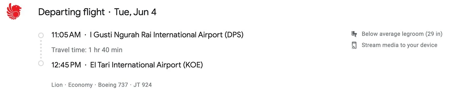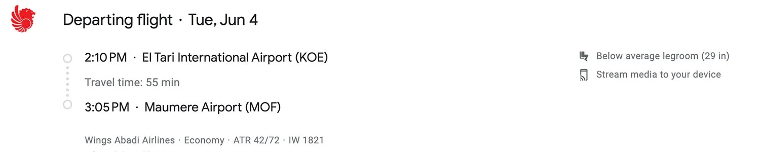• Inbound: 1 one-way ticket from Kupang (KOE) to Maumere (MOF)