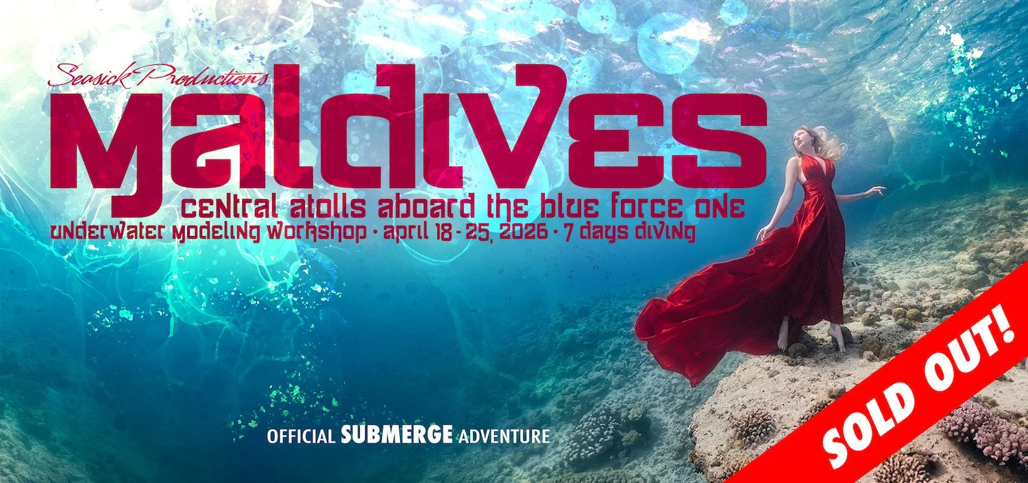 Justin Lutsky, a bonafide underwater photography magician (his work on this page doesn’t lie), and Abbey the Everyday Mermaid, have developed their latest Submerge experience: the Maldives 2026 Underwater Modeling Workshop. In fact, this is more than a workshop, it’s a dive adventure! Set against calm turquoise waters and uninhabited islands, the week is dedicated to creating stunning ocean-inspired art. Basecamp is the Blue Force One, where guests will have the entire vessel available to model, dive or simply relax. Participants will learn underwater modeling tips, tricks, and techniques, plus have the opportunity to shoot in new aquatic environments with the support of the Submerge team. Want a private island to use as a backdrop or place to chill? Deal. Want all meals included too? Done. How about mantas by day, mantas by night, sharks, more sharks, a couple more sharks, rays, eels, turtles and large schools of fish are all (almost) guaranteed. And while most tourists take home t-shirts and cheap airport jewelry as souvenirs, models enrolled in this workshop will leave with gorgeous photo and video content unlike any other. It’s gonna be sick!